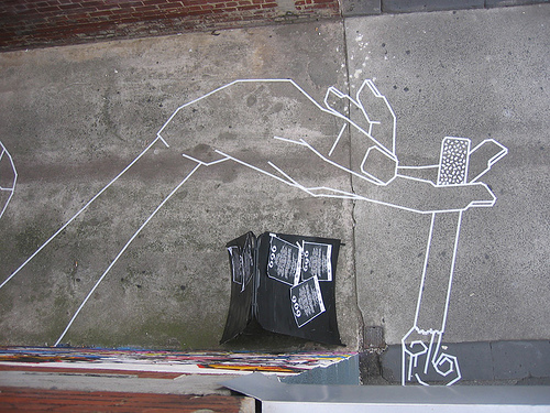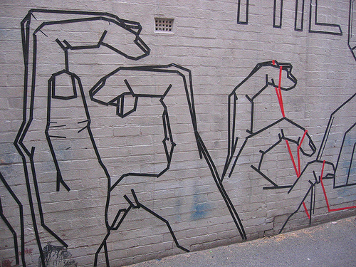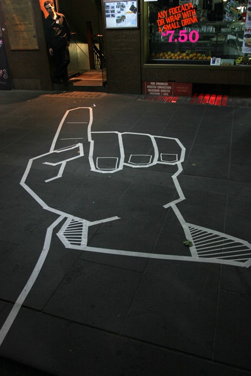 Buff Diss is a talented Australian street artist with an interesting, non-traditional style. Instead of spray cans, Diss does tape. Using mainly masking tape, Diss creates his pieces free-hand on the streets of Melbourne (and other Australia cities), and the decay of the tape wearing away over time is part of the appeal of the piece.
