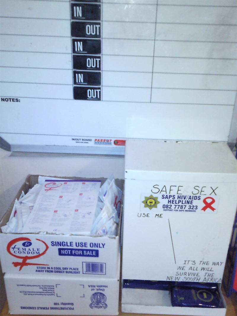 On a related note, Prawn and I were at the Ocean View police station last night – long story – and I was really pleased to see that they had loads of free condoms and femidoms prominently displayed right next to the front desk. I couldn’t resist snapping a photo of a rather amusing visual pun created by the profilactics and the station’s notice board, check it … after the jump.