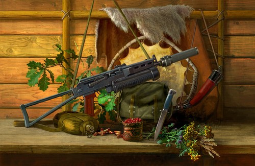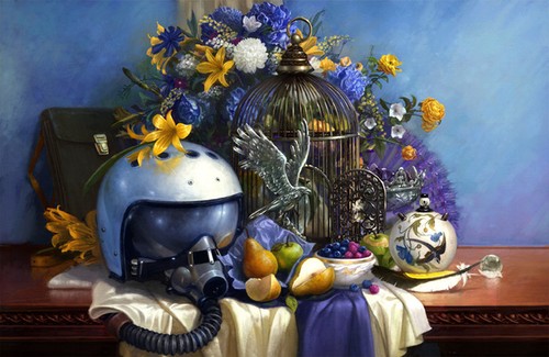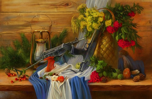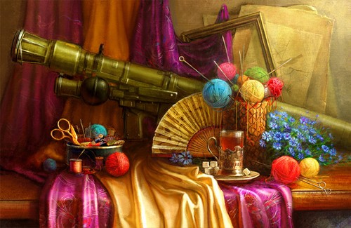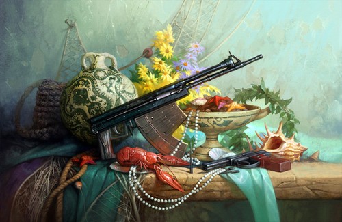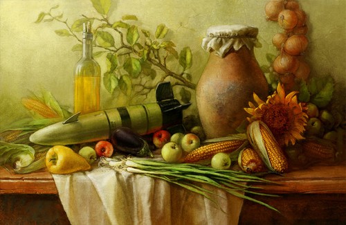 Geliografic studio is design collective based in Moscow, Russia. In their “Art of Innovation” series, they created a set of colourful still life oil paintings as if they were done by the old renaissance masters and added guns, ammo, and other weapons of war into the scenes. The images are presented beautifully but it’s a little worrying that weapons are so commonplace in society these days and that I didn’t think anything was out-of the-ordinary with the massive multi-shot grenade launcher lying right next to the bunch of tasty pumpkins.