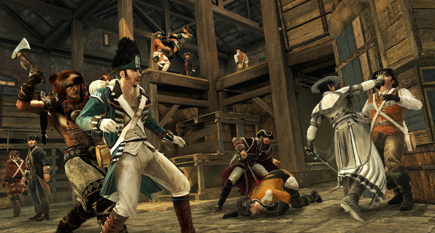 Gameplay-wise, there is a lot to Assassin’s Creed 3. Many of the familiar elements from prior games return to AC3, including a brotherhood of Assassins to recruit, a base of operations to upgrade (this time it’s an area called the Homestead), trading to be done, parkour to be parked, weapons to be collected, missions to be completed, side-quests to be sided, treasures to be located, areas to explore, and lots of killing to be done. Lots of killing. This time, though, your killing spree isn’t confined to just humans. No, now you’re good to kill animals, too; big animals, little animals, animals that climb on rocks, fat animals, skinny animals, even chickens with the pox; badgers, rabbit, wolves, bears, deer, elk…if it existed in the old Frontier, odds are it’ll be available for you to stalk, hunt, kill, and render down for parts. It all depends on how you get your jollies, I guess. All this bloodshed isn’t ENTIRELY senseless, though. You reap valuable raw materials from the slain, allowing you to make things at the Homestead, or trade them off for filthy lucre. There is a hell of a lot to do, and it may even start to feel overwhelming in terms of its sheer size. Frankly, for a reviewer, it’s a nightmare of a game, but in terms of the player, it’s a treasure-trove, purely because of the amount of time you can spend in the game without running out of things to see and do. Even when you do complete the main story, the old American Frontier still has a lot of content to keep you busy, multiplayer, and DLC notwithstanding.