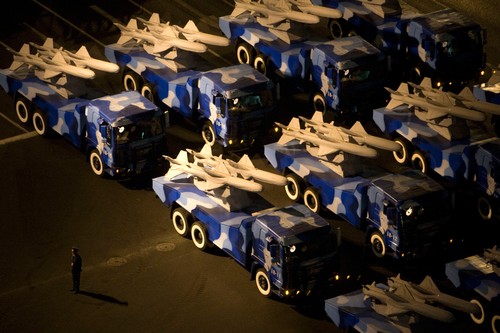 Chinese military vehicles are parked on Changan Ave. near Tiananmen Square during a rehearsal for a ceremony marking China’s 60th anniversary in Beijing, China, on Friday, Sept. 18, 2009.