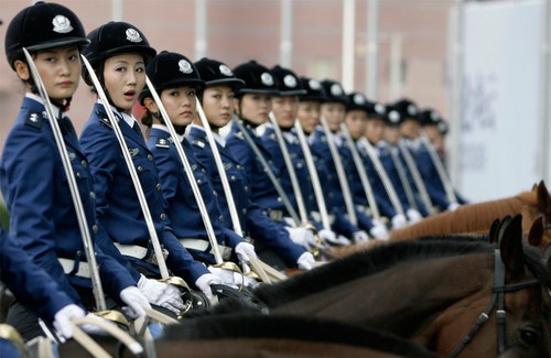 Policewomen on horseback stand guard in a line outside the World Expo Center, in China’s port city Dalian September 11, 2009.